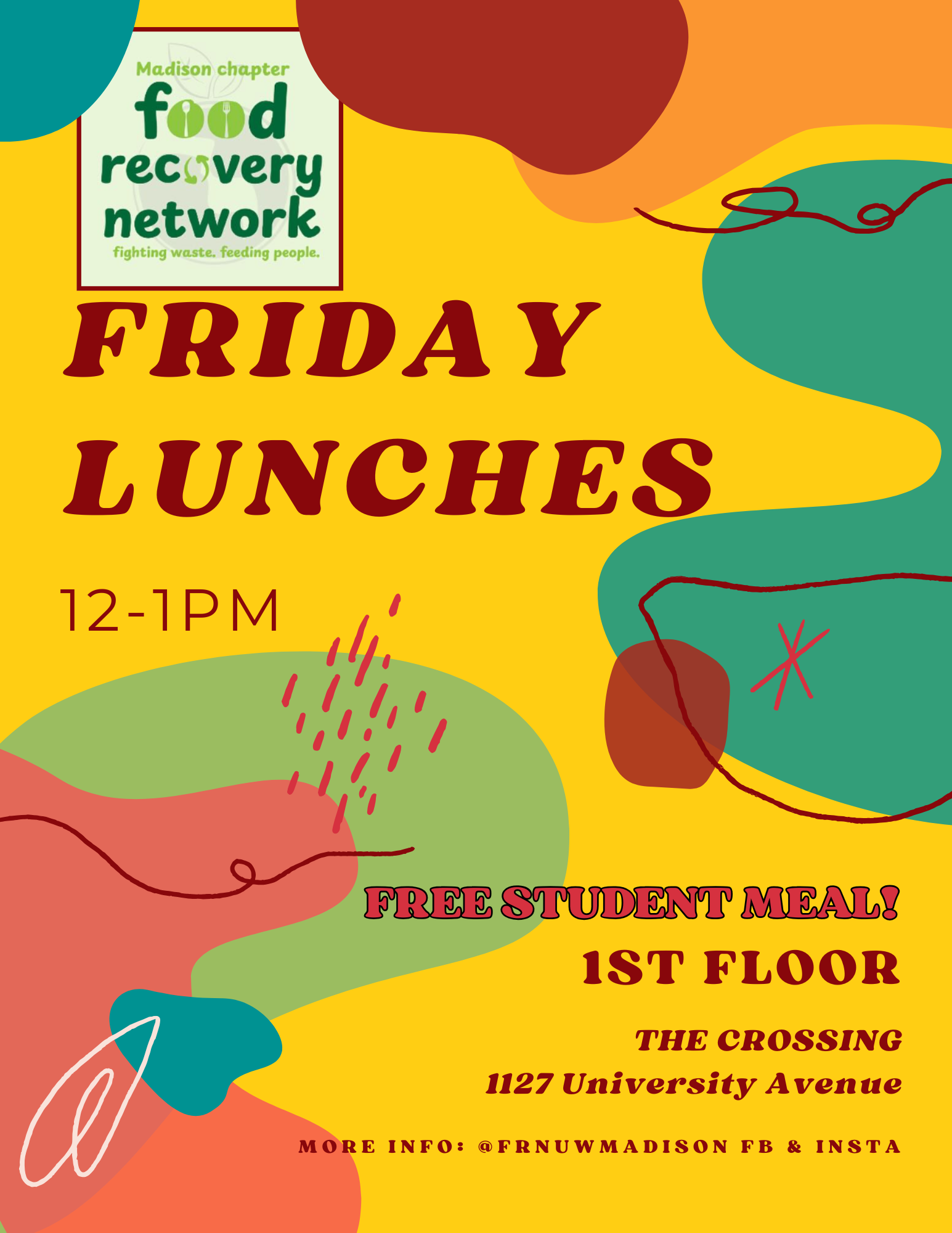 Food Recovery Network Lunch Friday, February 27, 2026 12:00 PM 1:00 PM First Floor Wesley Lounge 1127 University Avenue Madison, WI, 53706 United States (map) Google Calendar ICS https://www.instagram.com/frnuwmadison/?hl=en https://win.wisc.edu/organization/FRNUW